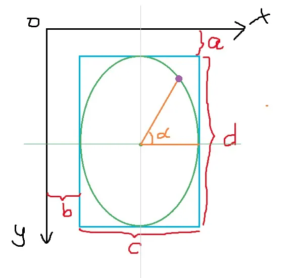 如图,根据初等数学知识不难算出,圆弧上的小圆圆心坐标 x = rect.left + rect.width() / 2f + mMinOvalR * Math.cos(α) y = rect.top + rect.height() / 2f + mMinOvalR * Math.sin(α)
