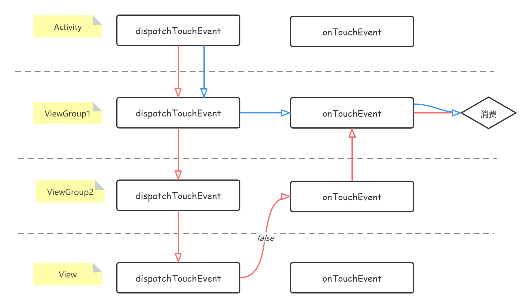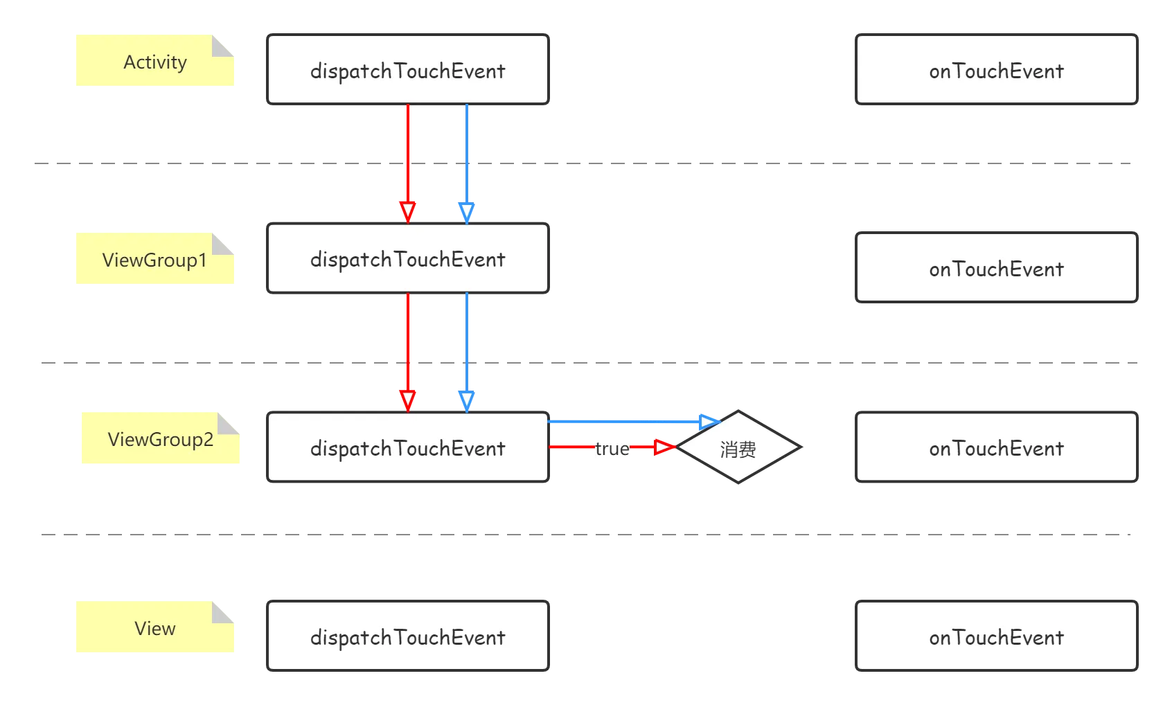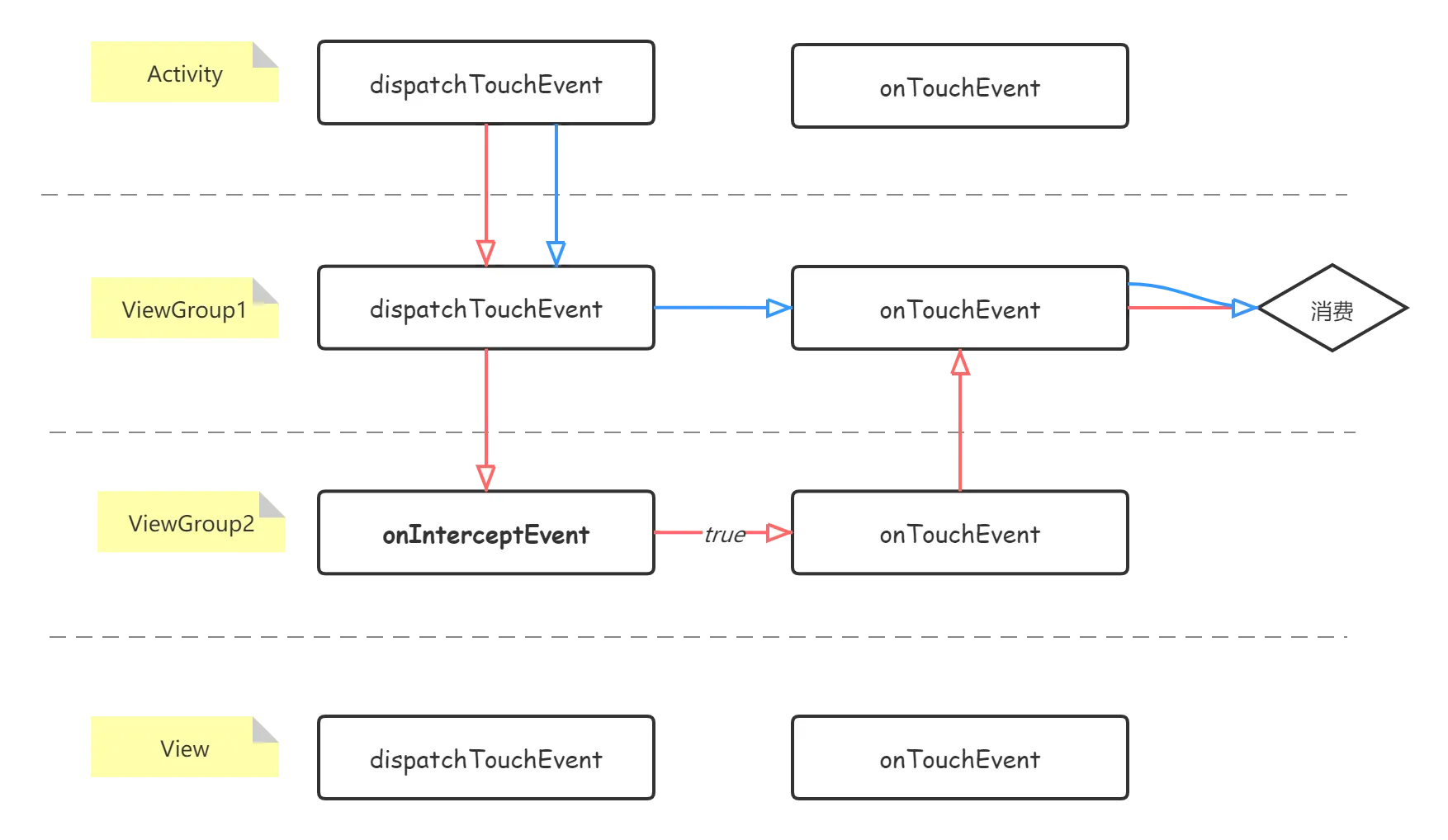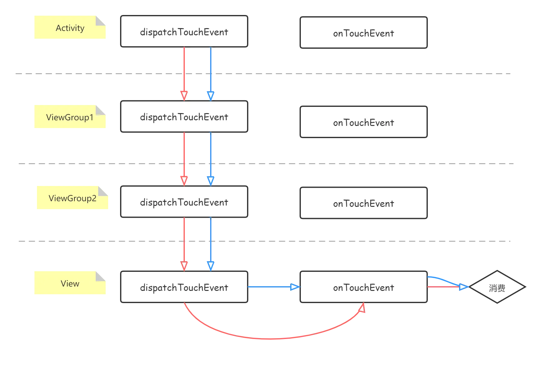 与 DOWN 事件不同,其他的都属于后续事件,默认情况下只有消费了先序事件(例如 DOWN)的控件才能收到后续事件,它的上层控件负责分派后续事件(有条件强行拦截)。这么说太抽象了,画个图看看(下图中红色表示 DOWN 事件,蓝色表示后续事件)