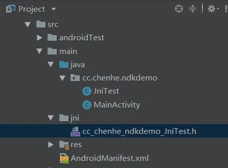 注意路径不要写错了,最后也不需要加文件扩展名。成功后会生成一个 .h 文件,把它手动移到 jni 目录。之前编译出的 .class 文件可以删掉了。最终目录结构如下: