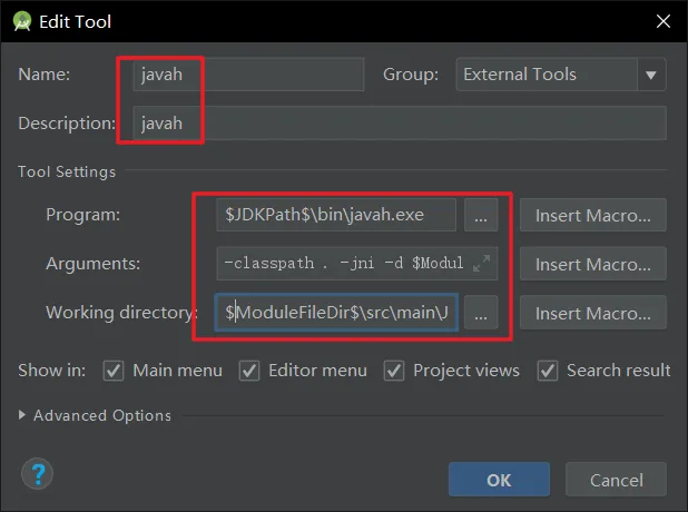 -classpath . -jni -d $ModuleFileDir$\src\main\jni $FileClass$ - Working directory: