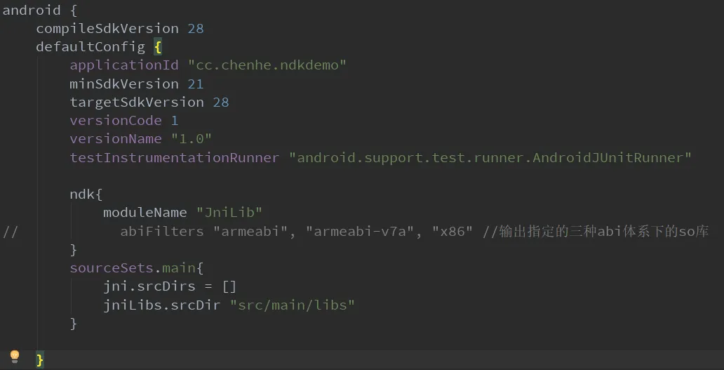 //abiFilters \"armeabi-v7a", "x86" //输出指定abi下的so库