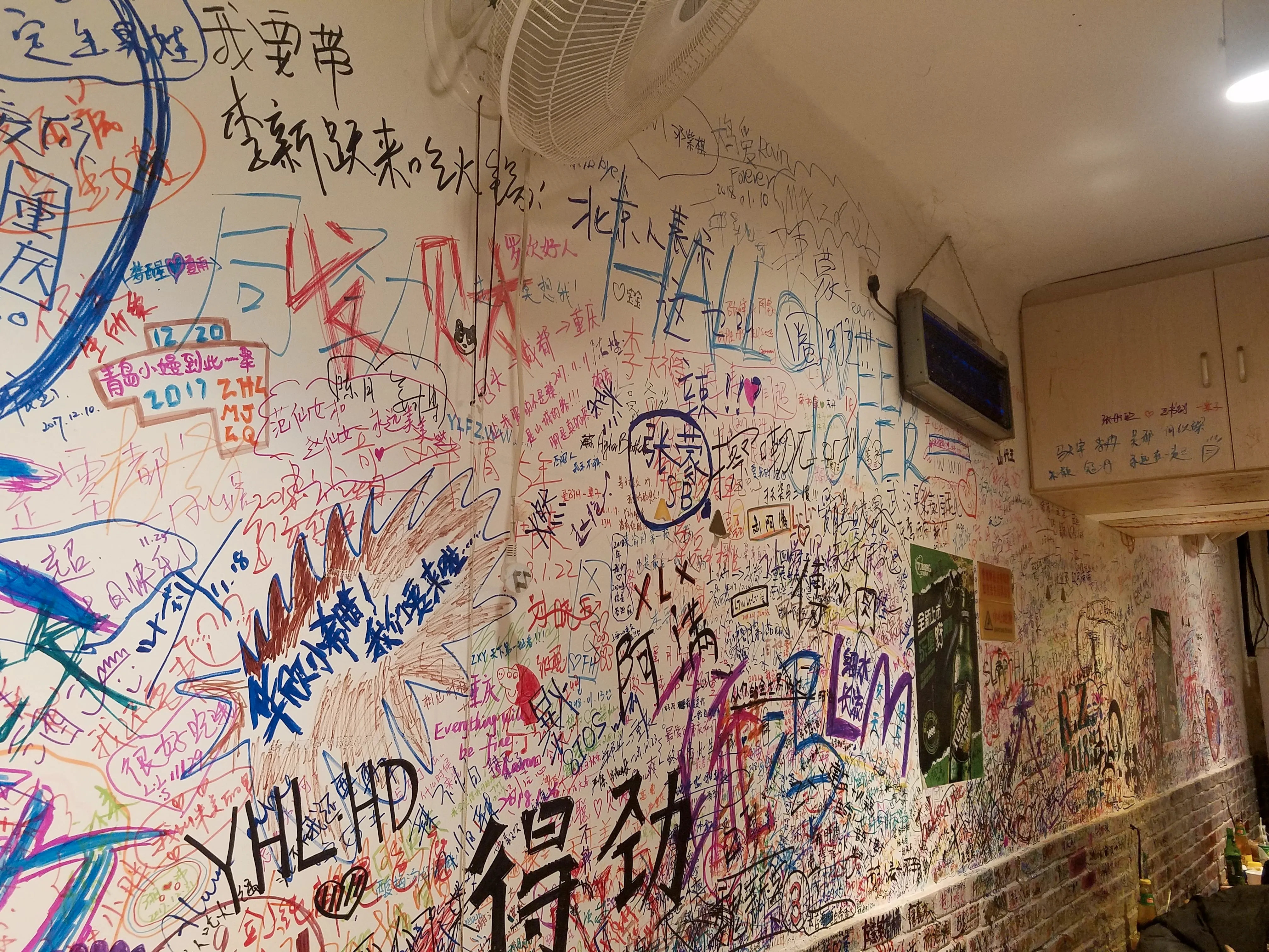 里面装修朴素,墙上写满了各种食客的留言,也提供了记号笔可以自己涂鸦。比较有旅游的感觉。 重庆大部分红锅的火锅底料是免费的(或者收费很少),但如果你不能吃辣要清汤的话就要掏点银子了,也不是很贵,30多的样子。既然来到了重庆,我还是推荐各位不要错过这里的麻辣。当然,也要量力而行。洋马儿这家店提供了以下几个辣度等级: