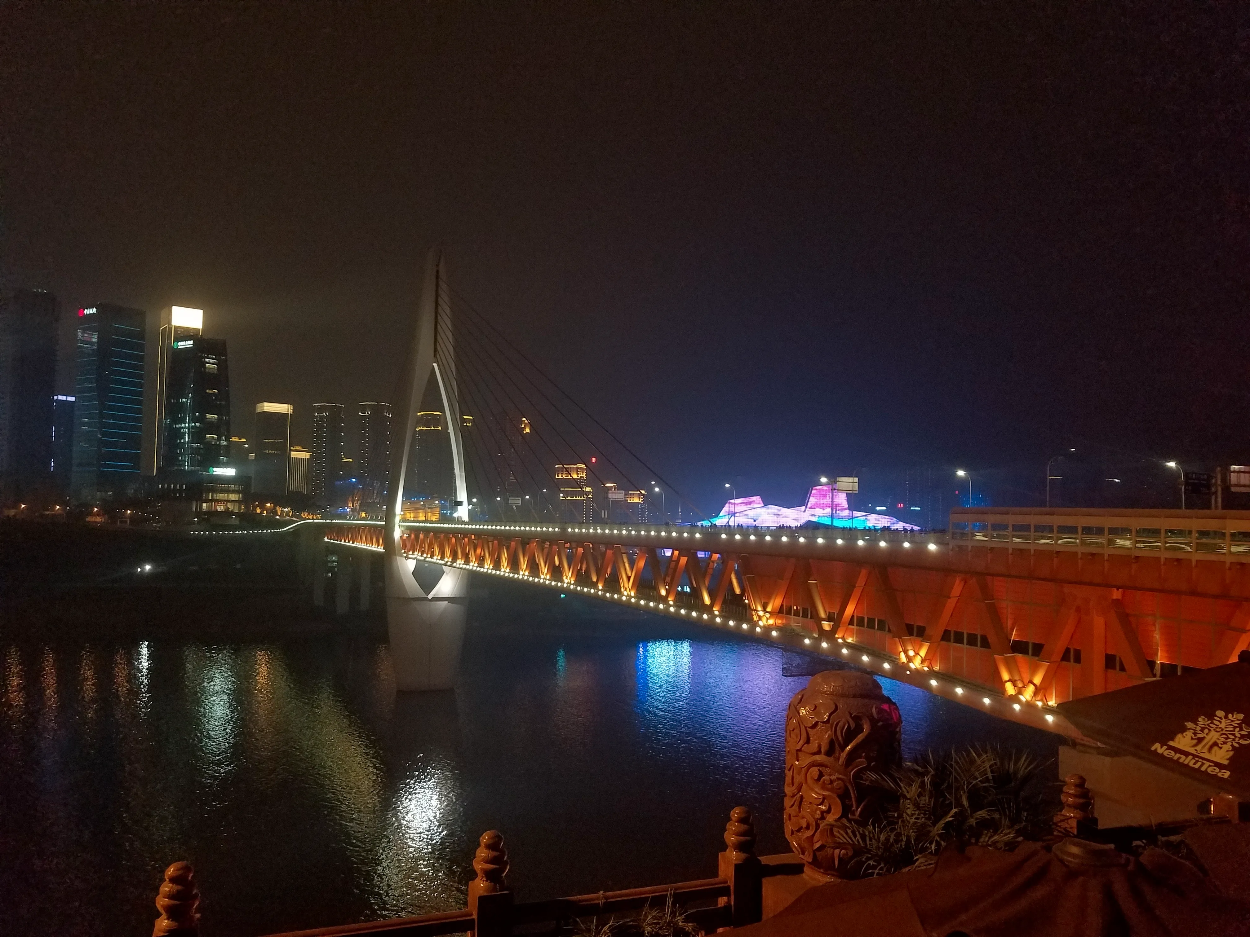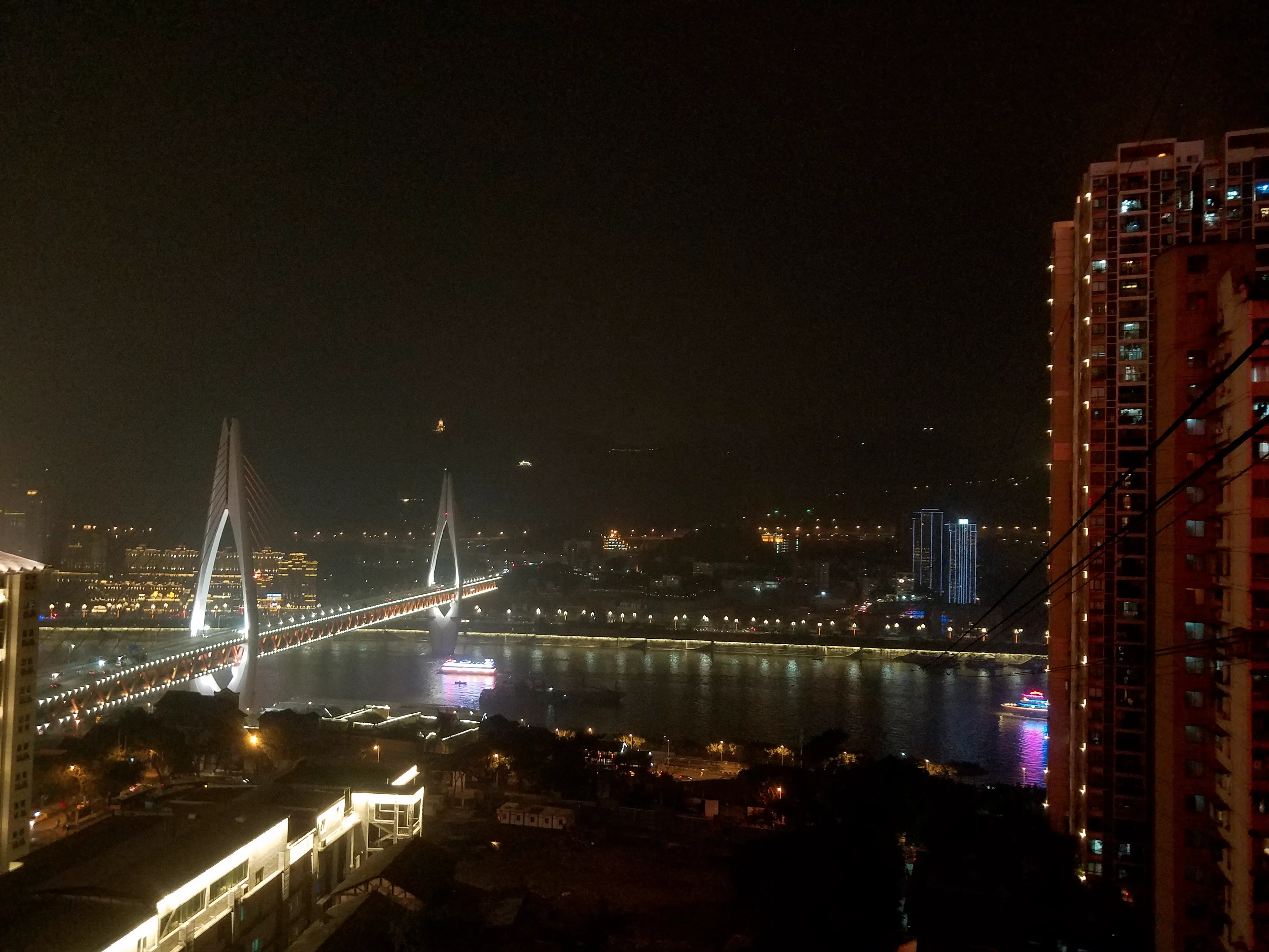 到达市中心已是晚上七点多,下车后步行前往洪崖洞。洪崖洞是一个民俗区域,共11层。从市中心前往的话直接到达的是11层,先不着急下去,走上旁边的过江大桥,远距离观望下洪崖洞,真是璀璨。