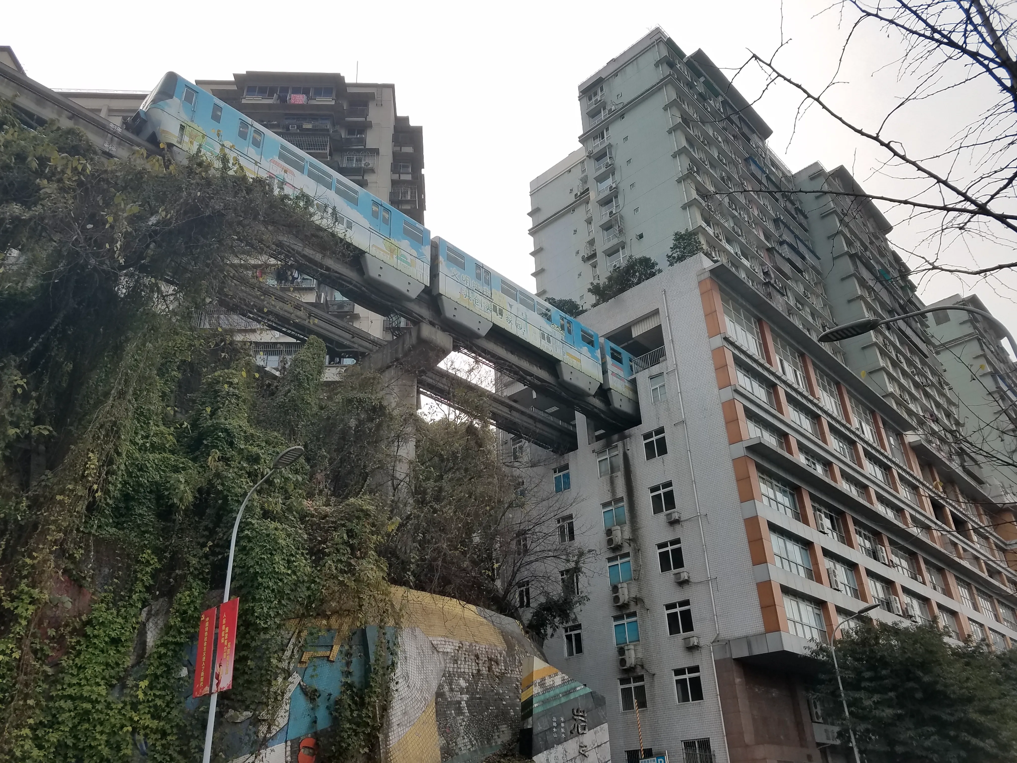 绕出来后去轻轨二号线坐到李子坝,这里是网红的那个轻轨穿过大楼的站点。有无人机的可以带着。出站后往两边走走就可以看见建筑物上打的洞了→_→。