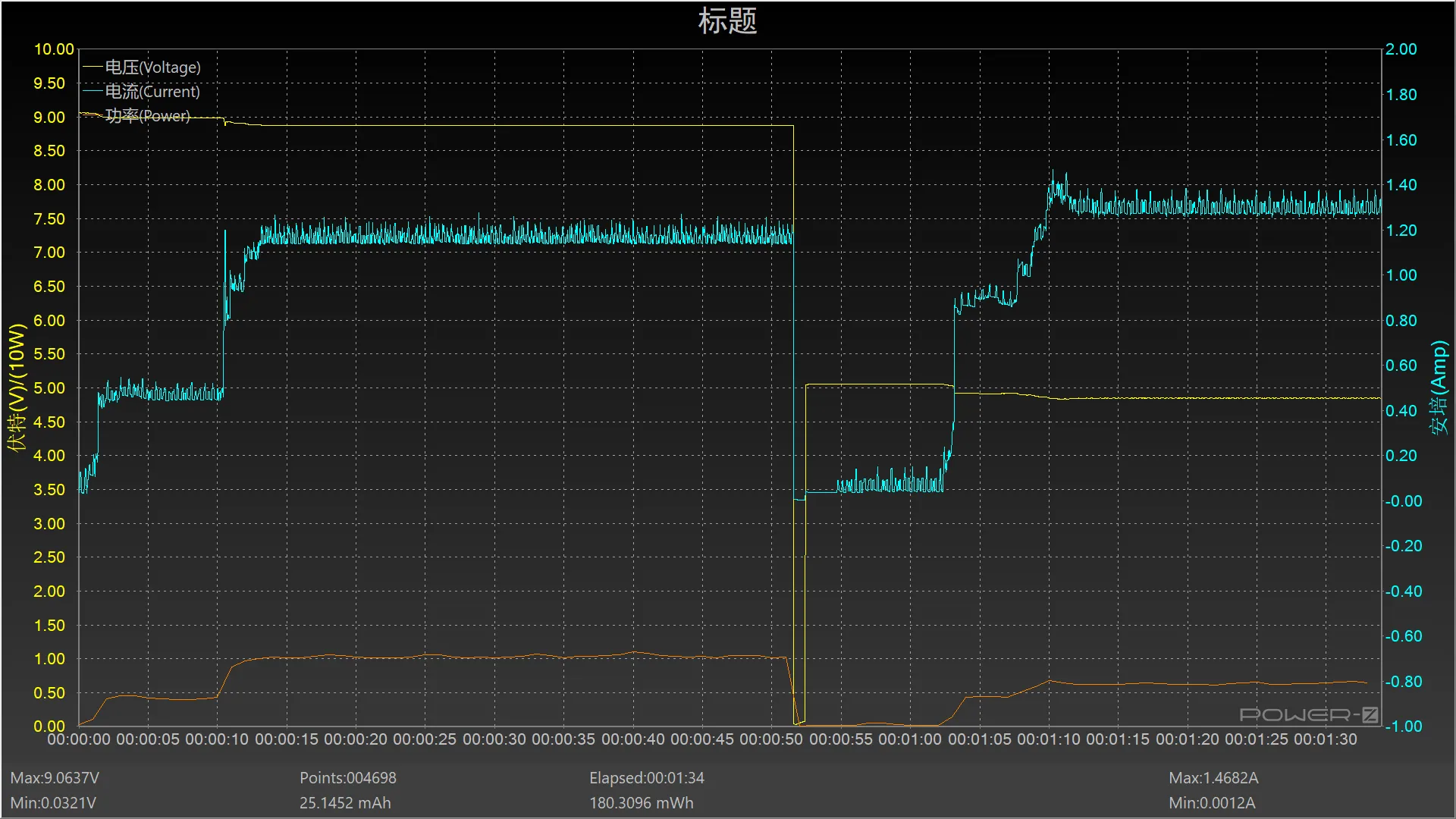 上图明显看出 50 秒左右发生重启,之后功率只有原先的一半左右。