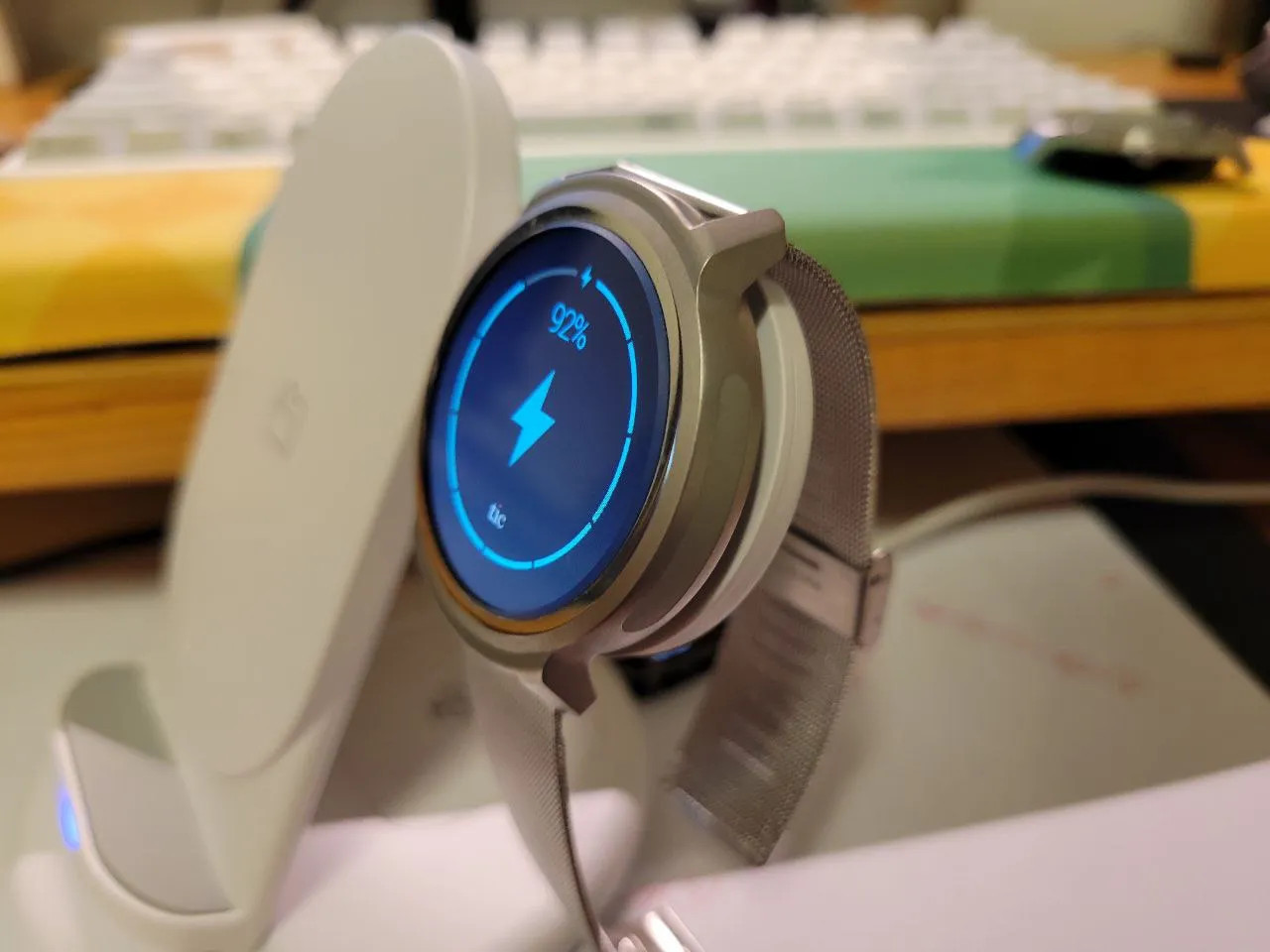 奥对了,TicWatch 不支持磁吸,所以… 你可以把本体拆下来躺平冲,或者粘上它 或者像我这样依靠表带重量达到微妙的平衡。