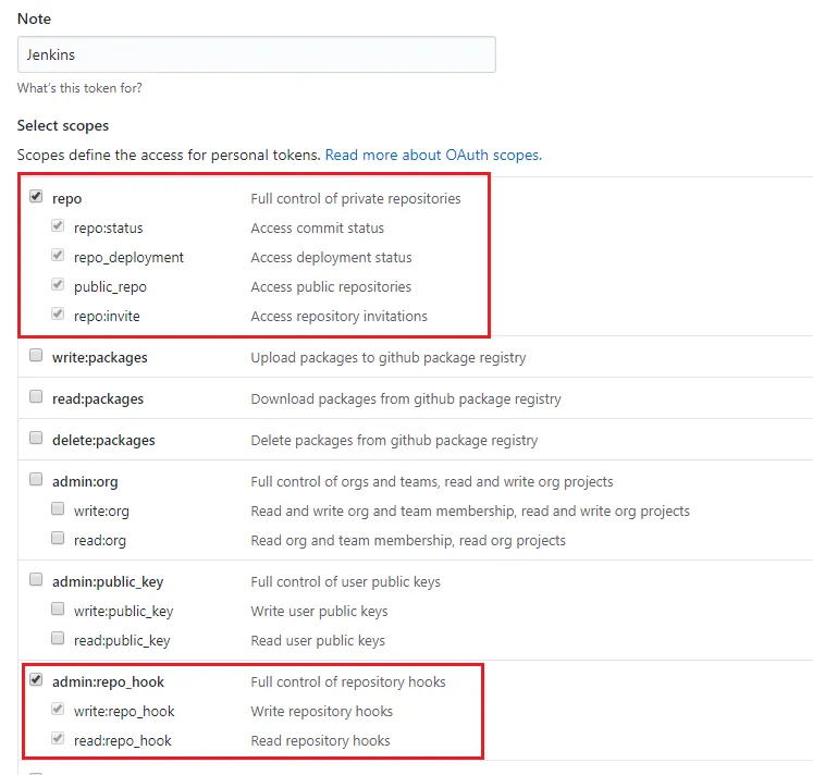 去 GitHub 生成一下 AccessToken,Note 就是一个备注随便填,下面的授权范围要勾选 repo 和 admin:repo_hook.