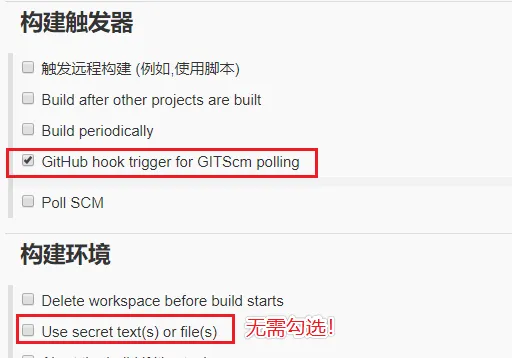 源码库浏览器选择 githubweb 并在下面填上项目地址。构建触发器选择 GitHub hook...。⚠️注意!下面的构建环境无需勾选! 很多教程会要求勾选 Use secret text(s) or file(s),经过实际测试这个用不到。如果你真的选了必须在 变量 处指定一个变量名,如果留空执行任务的时候会出现 87 参数错误,被这个问题坑了好久气死惹👿