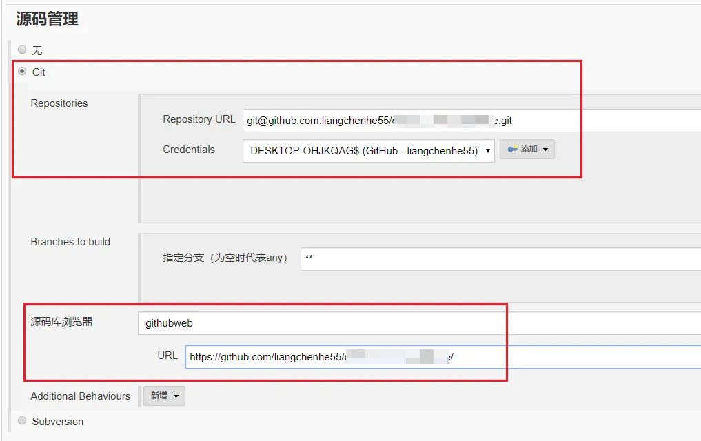 源码管理选择 Git 并输入仓库地址(也就是 git clone 时用的地址,注意和项目地址区分),如有必要根据实际情况添加并选择凭证。如果使用 https 方式那么就添加用户名和密码,使用 git 方式就添加私钥。
