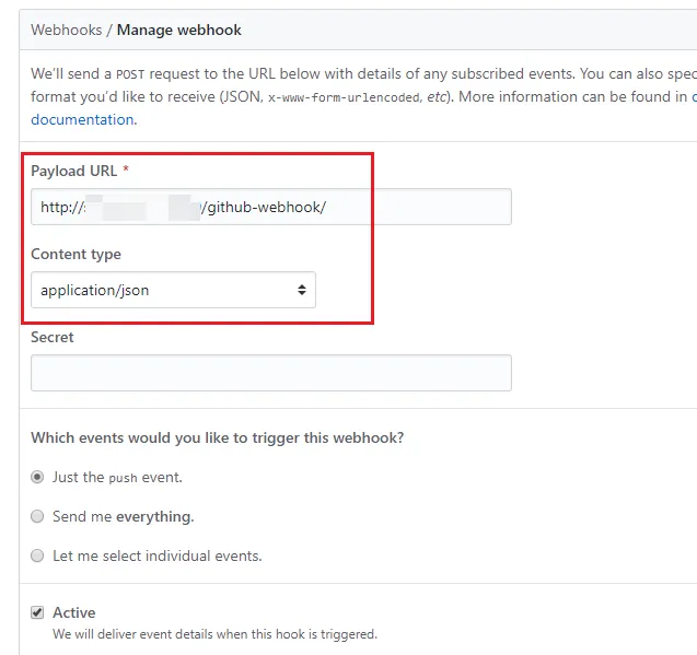 Payload URL 输入 http://[Jenkins 访问的地址]/github-webhook/,格式选择 json,其他保持默认点击添加就行。