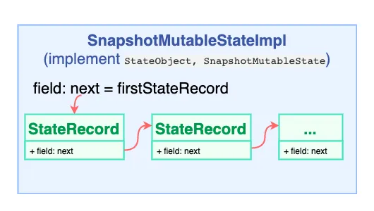 SnapshotMutableStateImpl 是具体实现,它以链表形式储存了一串 StateRecord,每一个节点就是这个变量在某一状态时的值,与某个 Snapshot 对应。Snapshot 有先后关系,储存了某一状态下所有变量的值。