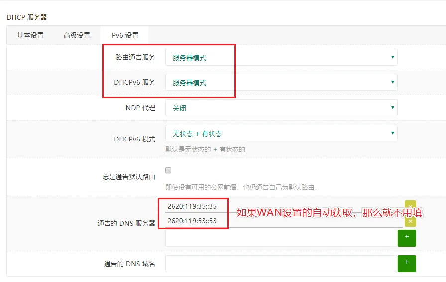 如果 WAN 配置 IPv4 的时候没有勾选使用对端通告的 DNS 而是手动指定的,那么此处必须同步指定 IPv6 的 DNS。