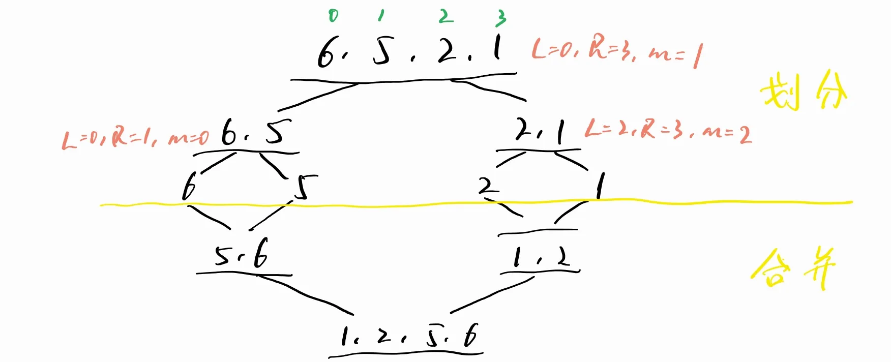 例如对于数组 [6, 5 ,2, 1] 归并排序的流程如下: