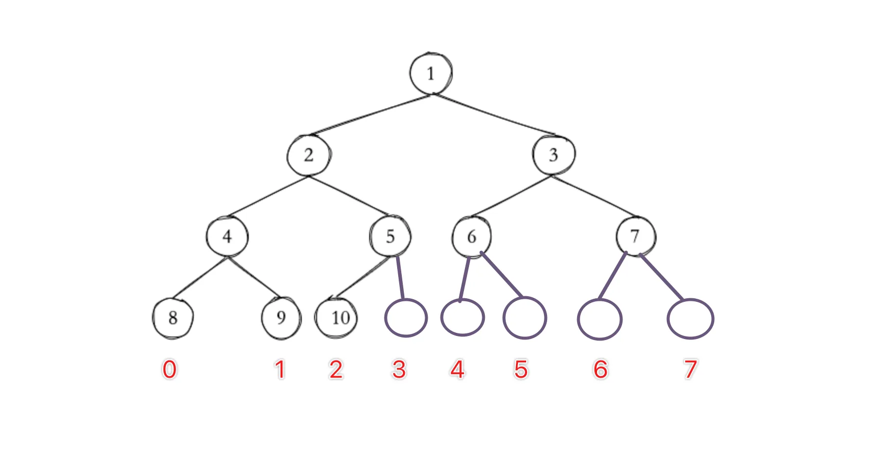 如图所示,我们给底层节点编号(包括不存在的节点),形式上把它们视为有序数组。也就是说,只需在 时间复杂度内从这个数组中找到最后一个存在的节点就行。这个需求很轻松地联想到二分查找。