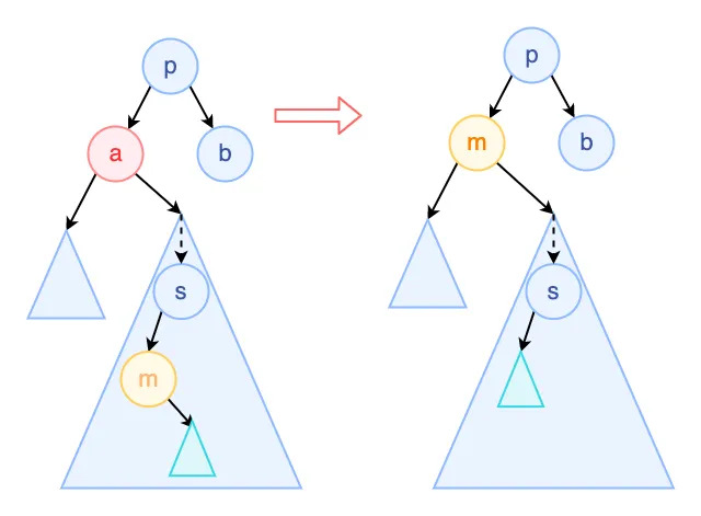 这种情况就比较复杂了。首先要从右子树里找到最小的一个元素 m,用它补上原来 a 的位置。然后 m 原先的右子树直接作为 m 原先父节点 s 的左子树。这种做法之所以行得通,是因为: