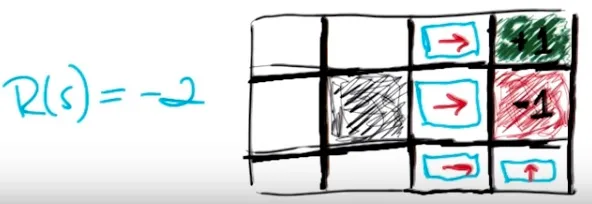 当空白格子奖励为-2,为了最大化长期期望奖励,智能体应该尽快结束游戏。基于此可得上图策略。 需要注意,第(3,1)格不可以向上。若向上则有10%概率向左,距离结束位置更远。