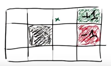 从起点开始,每次选择往四个方向走一格子。目标是到达绿色格子,游戏结束,碰到红色则失败,游戏结束。 黑色格子为障碍物,碰到障碍物或撞到墙壁则原地不动。 但是每次移动准确率只有80%,另外有20%的概率向与目标方向垂直的方向移动,这两个垂直的方向概率各是10%.