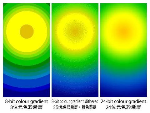 我们知道计算机中所有颜色都是由红绿蓝(RGB)混合而成。每一种颜色称为一个通道。色深就是每个通道用多少空间去表示。所以,色深越大颜色表达的越精细,渐变也就越平滑。