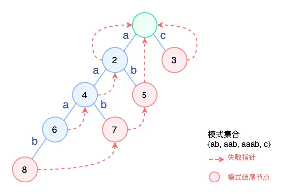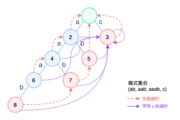 可以看到,为了搜索潜在的模式串 aaab 我们一直搜索到 6 号节点,然后一步步失败,直到根节点,然后才重新匹配到了 c,要是可以一步到位就好了。