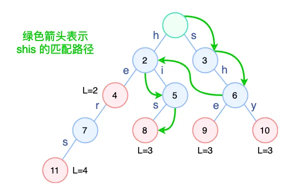 如上图,以搜索字符串 “shis” 为例。在节点 6 失配(因为 6 不包含字符 i),于是跳转到 6 的失败节点 2 再次尝试匹配 i。匹配成功,依次往下最终匹配 his。