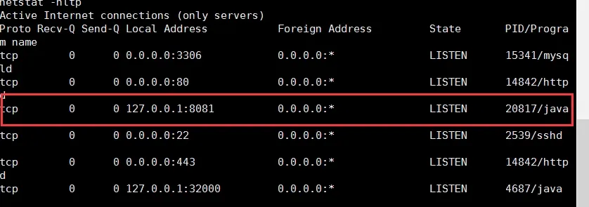 执行后,我们使用命令netstat -nltp,发现linux已经开启了一个8081端口开始监听: