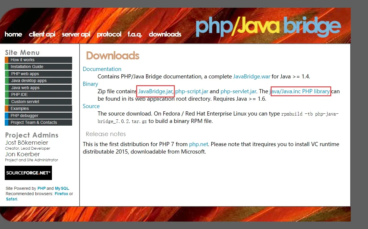 - 下载二进制的 JavaBridge.jar包、java/Java.inc库文件,下载地址:http://php-java-bridge.sourceforge.net/pjb/download.php