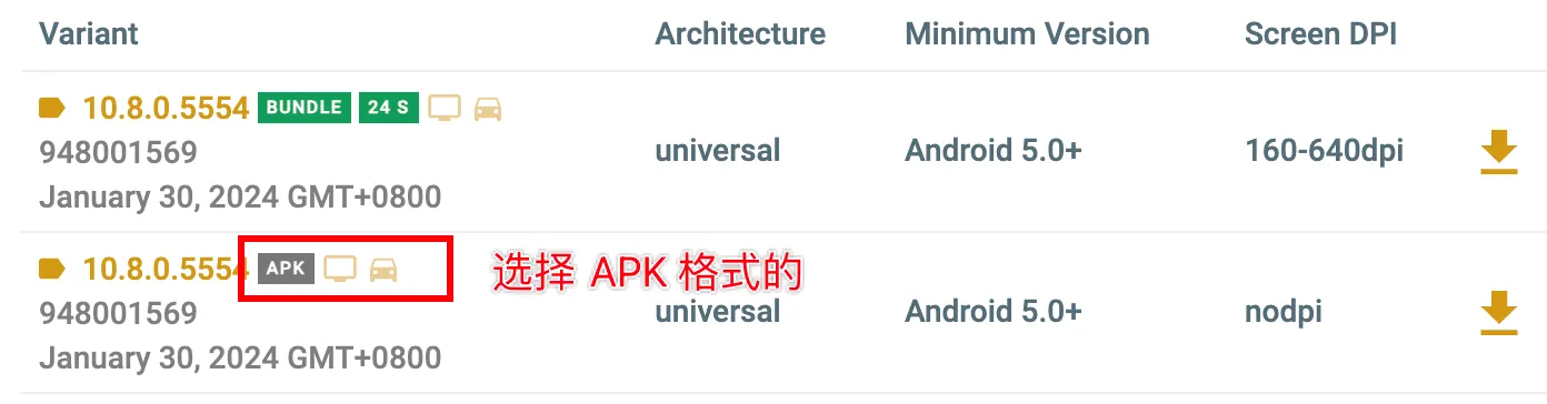 下载安装包的时候需要注意两点,首先是格式。「BUNDLE」是更先进的安装包格式,它可以动态加载资源,但在大陆水土不服,并且系统默认无法直接安装。所以一定要选择 APK 格式的。