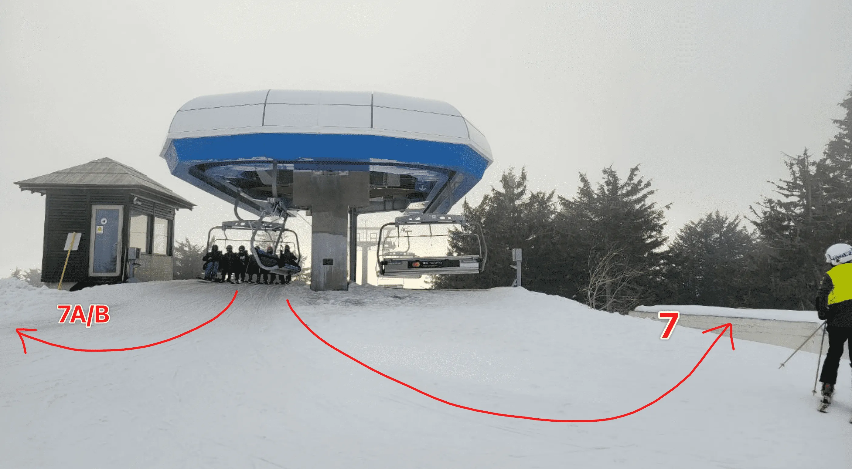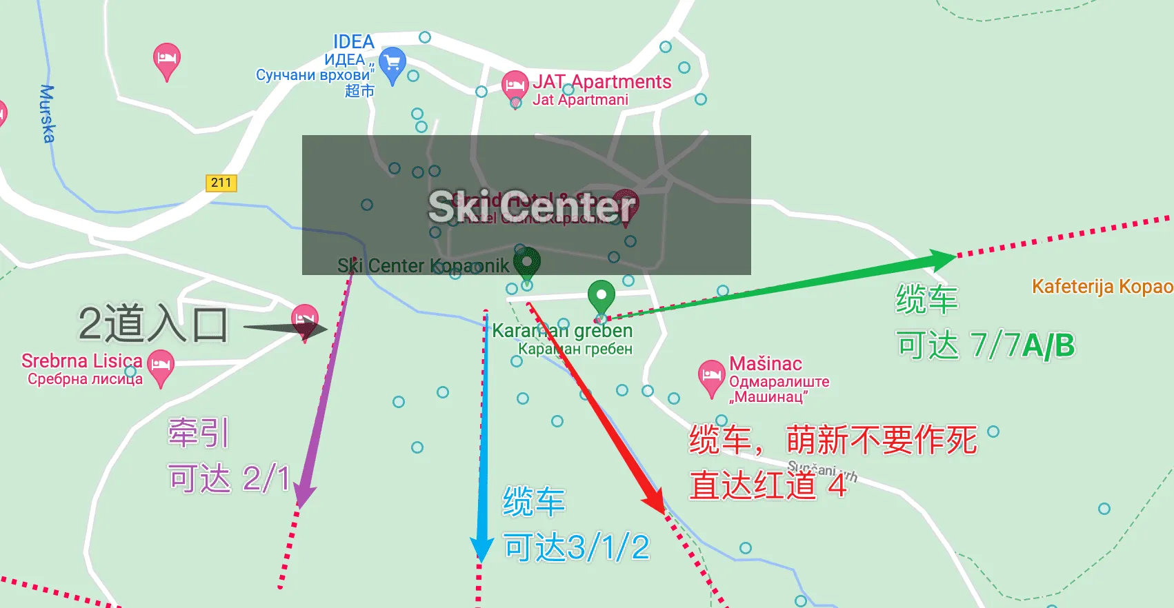刚刚离开新手村的同学建议乘坐最东北的缆车,出来后左转,滑⑦号道(不是 7A 或 7B)。或者乘坐最西面的缆车(不是牵引梯)下来左转滑 ③号道。千万不要作死乘坐中间的 4 号缆车直达④号红道,否则可能面临下不来的尴尬场面。